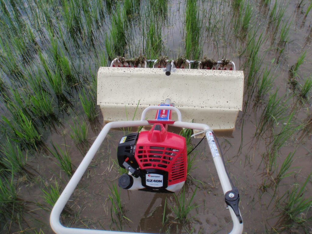 2016年までは、初期除草機とチェーン式の2条用除草機を併用して格闘していましたが、不耕起田の硬い土壌と密集する草の抵抗は、想像以上に過酷なものでした。